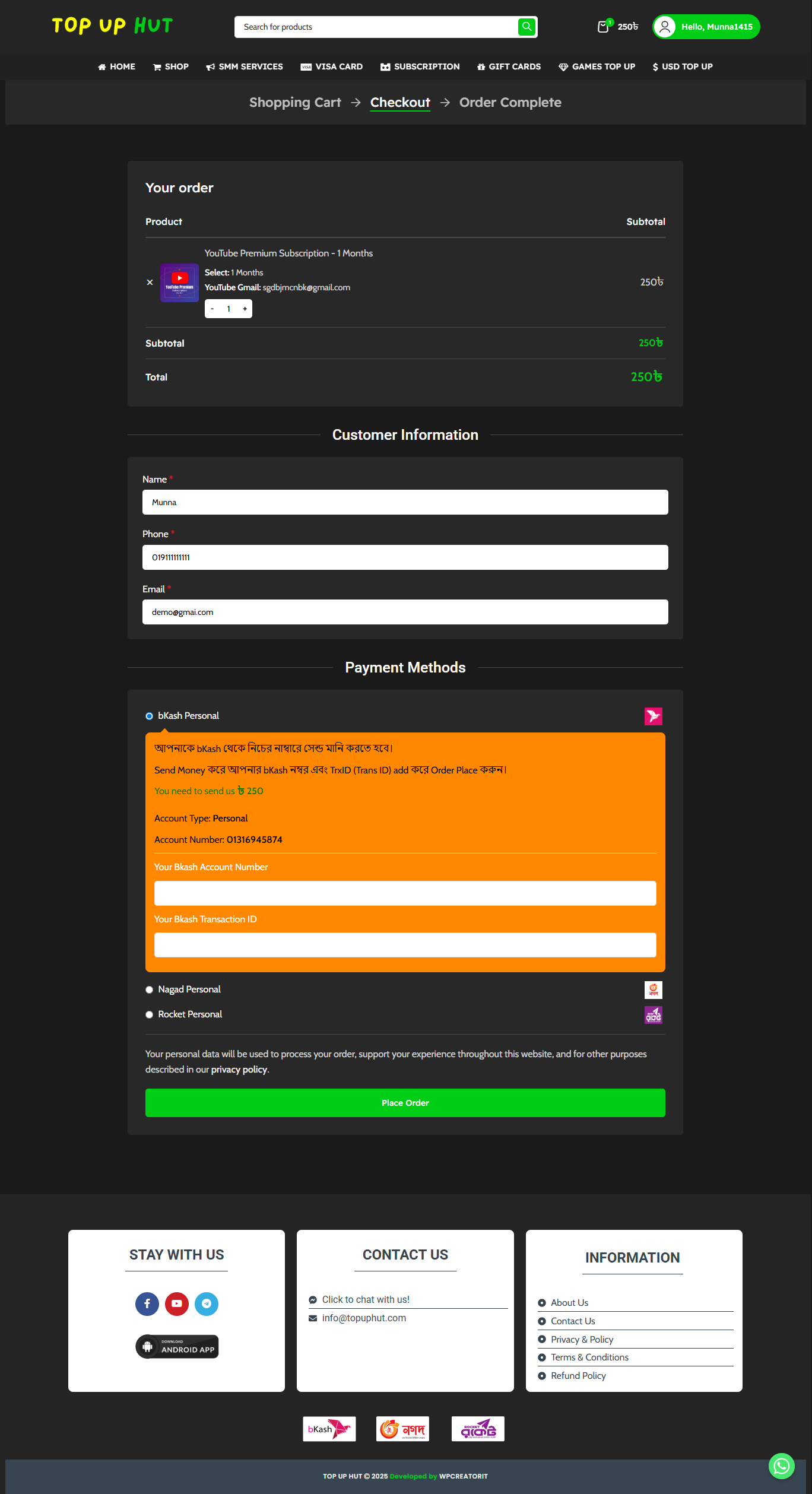 - Bkash, Rocket, Nagad, Paypal, Stripe payment gateway supported.