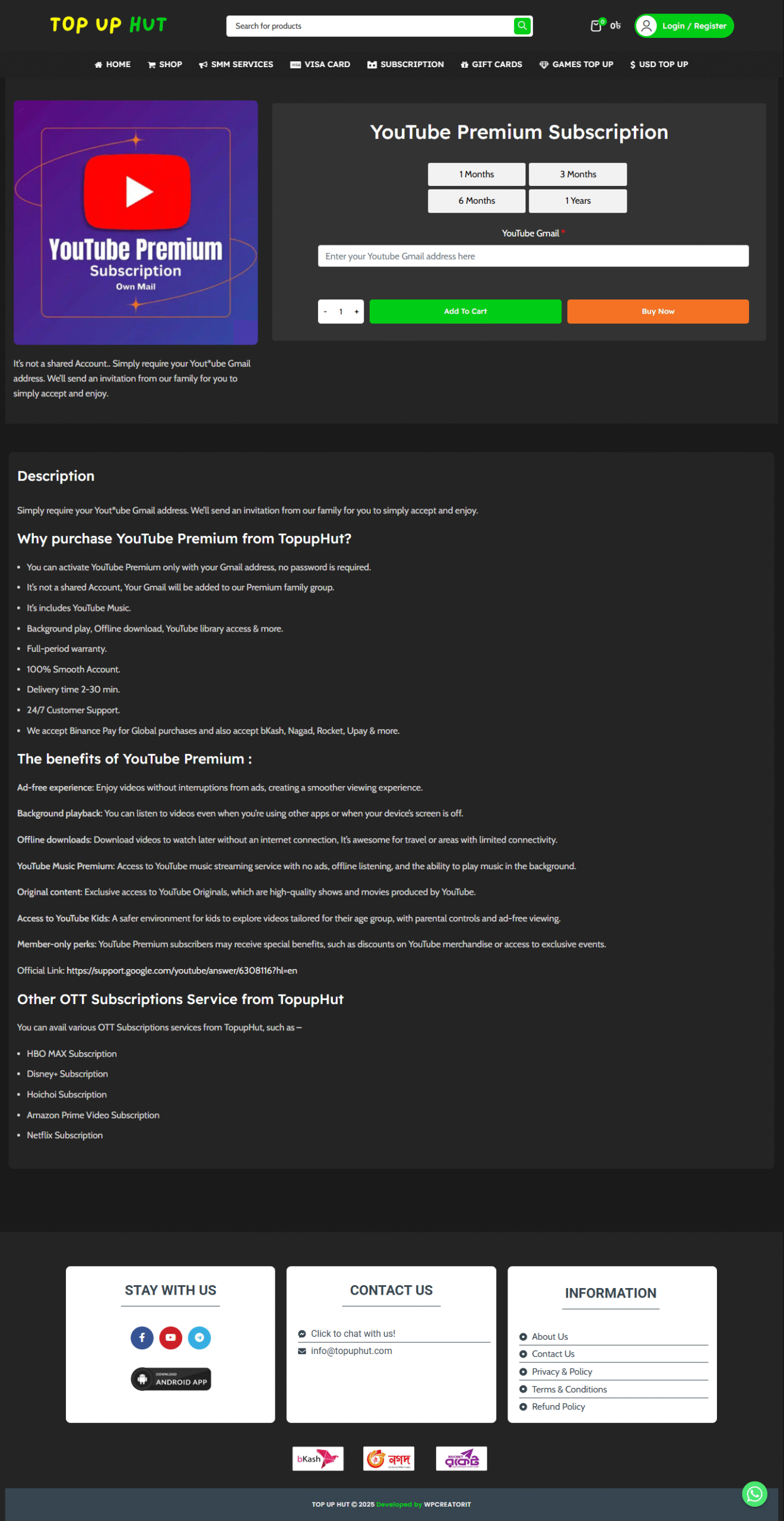 The best premade WordPress website backup file/code to make virtual visa cards, gift cards, and gaming topup websites. Your user can buy items from this site and you will get an email after placing the order. And your user also gets an email if his order is approved.