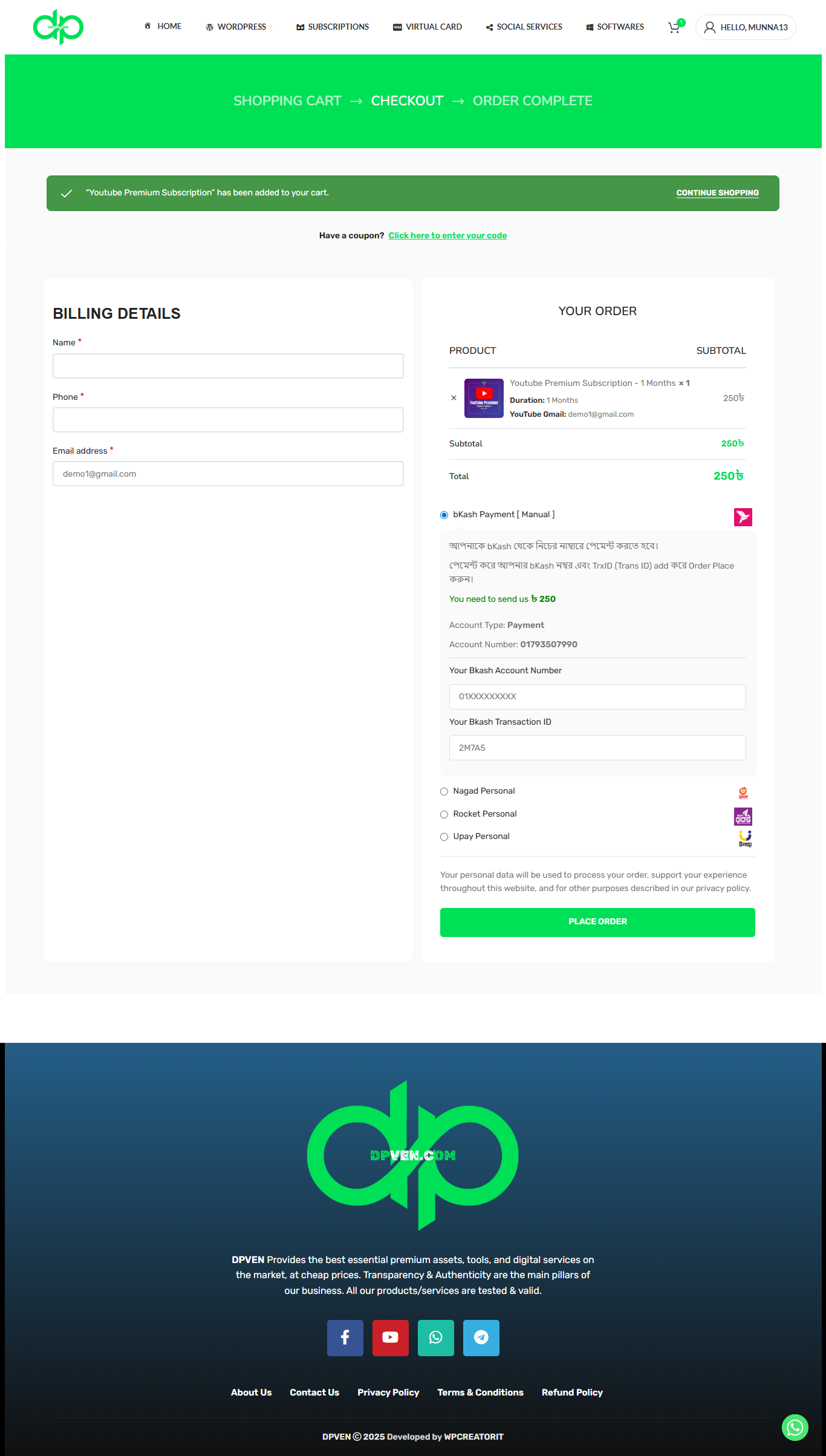 The best premade WordPress website backup file/code to make Digital Product, Subscriptions, Theme, Plugin, Softwares & Social Services Selling websites. Your user can buy items from this site and you will get an email after placing the order. And your user also gets an email if his order is approved.
