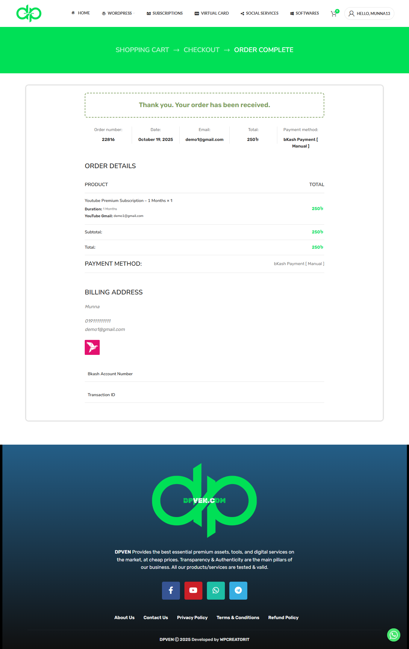 The best premade WordPress website backup file/code to make Digital Product, Subscriptions, Theme, Plugin, Softwares & Social Services Selling websites. Your user can buy items from this site and you will get an email after placing the order. And your user also gets an email if his order is approved.