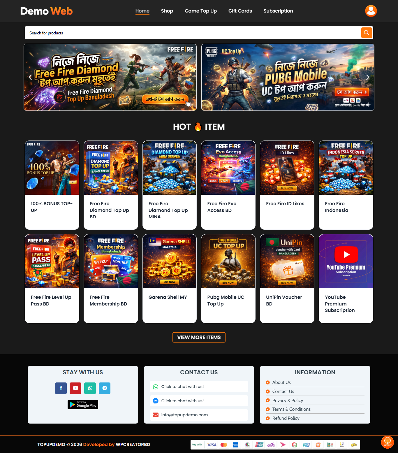 (Demo-10) Free Fire, Pubg, Games Top Up, Voucher, Gift Card Selling Website Code (Automatic Voucher delivery)